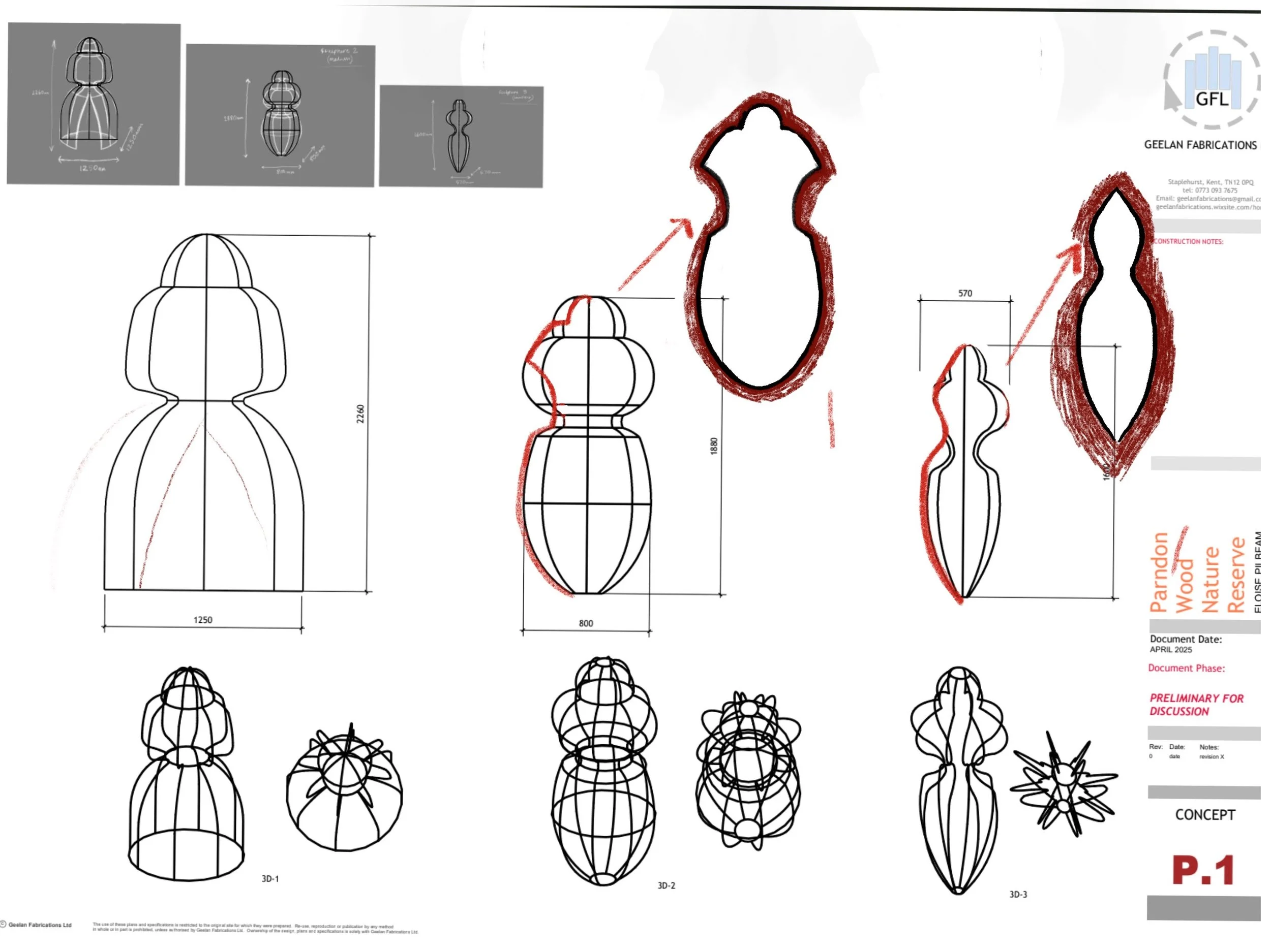 From there, I worked with the brilliant Dermot at Geelan Fabrications to translate the drawing into a 3D steel framework. This version (image below) captures how the shapes will feel in 3D space. Seeing the form in wireframe really helped me understand how the curves will lift, taper, and hold weight.