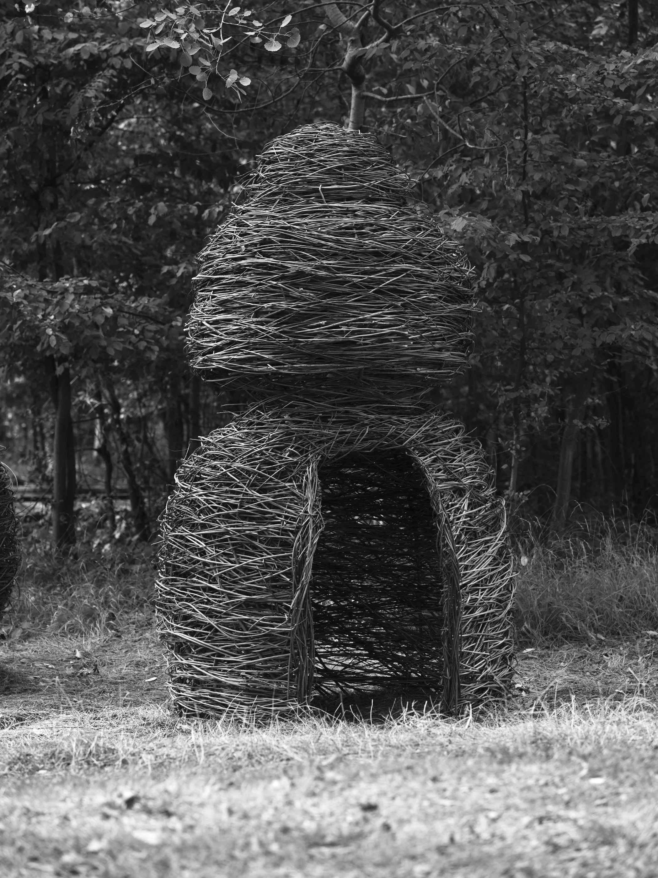 An abstract sculpture made of bundled, colorful, worn-out fabrics, ropes, and chains, with a wireframe structure visible in the background.